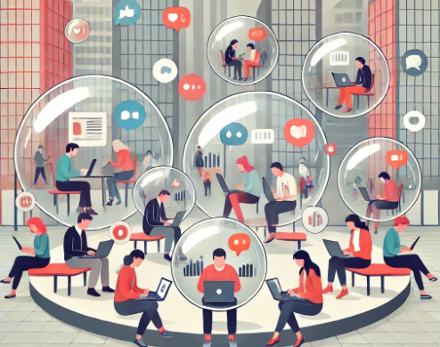 알고리즘 추천시스템은 사용자가 클릭한 콘텐츠와 유사한 정보를 반복적으로 추천함으로써 확증 편향을 심화시키며, ‘필터 버블(Filter Bubble)’ 현상을 통해 다양한 관점을 접할 기회를 차단합니다. ‘필터’는 선택된 특정 요소만을 통과시키고 나머지는 배제합니다. 알고리즘이 사용자의 관심사, 선호도, 과거 데이터 등을 기준으로 정보의 일부를 필터링하도록 설계되어 있기에 사용자는 자신이 원하거나 선호할 가능성이 높은 정보만 접하게 됩니다. ‘버블’은 필터링이라는 선별 과정이 만들어낸 폐쇄적이고 제한된 정보 환경을 나타냅니다. 사용자가 외부 정보와 단절된 채 자기만의 편향된 정보 환경에 갇히게 되기에 ‘필터 버블’이라는 표현이 만들어졌습니다. 사용자는 자신의 신념과 유사한 정보만 접하게 하여, 반대 의견이나 새로운 관점을 받아들이기 어렵게 됩니다. 정보의 편향성은 정치적 양극화를 심화시키고 사회적 갈등을 더욱 부추깁니다.