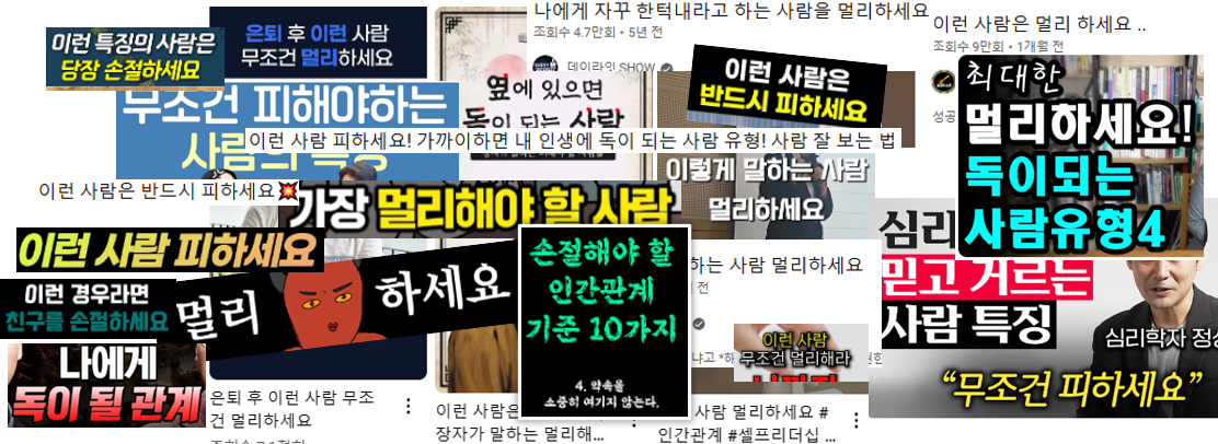 ‘이런 사람은 손절해야 합니다’, ‘당신 주변에 이런 사람이 있다면 지금 당장 멀리하세요’, ‘이런 사람과 어울리면 당신 인생이 망가집니다’, ‘이런 사람과 엮이면 안 됩니다’와 같은 제목의 썸네일들을 보게 됩니다. 이러한 말들은 인간관계를 ‘좋고 나쁨’의 문제로 축소하고, 문제 해결을 위한 조정과 이해보다는 관계의 단절을 유일한 해결책으로 제시합니다.